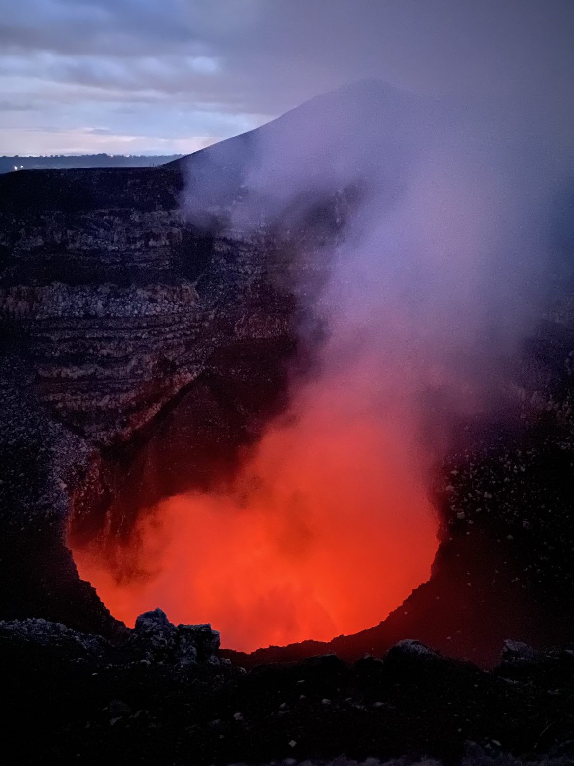 Der Vulkan machte eine gigantische eine Rauchwolke, es sah aus wie eine riesige Explosion in Zeitlupe. Das Gas der Rauchwolke war Schwefelgas und Schwefelgas stinkt nach verfaulten Eiern. Aber aus irgend einem Grund roch man es zum Glück nicht. Vom Aussichtspunkt sehe ich bis tief in den Krater bis zur Lava.