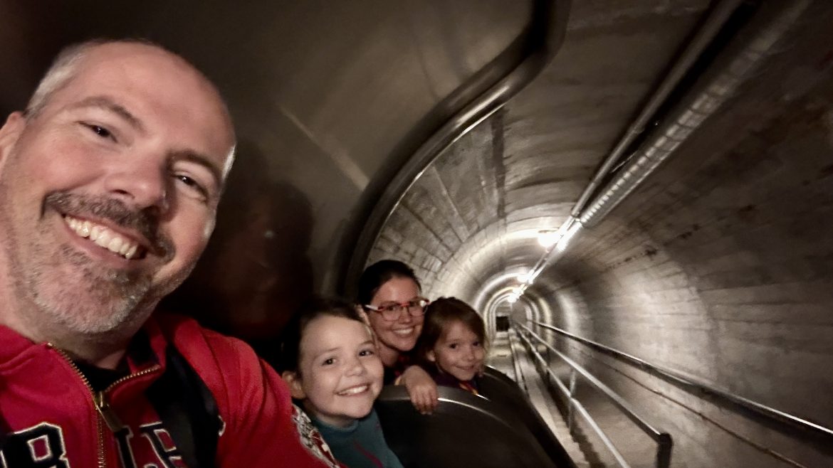 Zuerst mussten wir den Tunnel für die LKW Anlieferungen entlanglaufen, bevor wir durch einen 200 Meter langen Schrägstollen in das obere Stockwerk gelangten. Im unteren Stockwerk befindet sich auch heute noch das Militär, der obere Teil wird als Museum erhalten. Weitere Gänge passierend, erreichten wir nach etwa einer Viertelstunde den Empfangsbereich. Hier bezahlten wir und dann ging die eigentliche Führung los. Uns wurde einiges zur Geschichte und der Bedrohungslage im zweiten Weltkrieg beigebracht. Sehr interaktiv konnten wir verschiedenste Dinge ausprobieren, anschauen, erfragen und so weiter. Spannend war es! Die Mädchen waren sehr interessiert. Bald erzählte uns Herr Senn, dass am Vortag eine Gruppe mit desinteressierten, sich schlecht benehmenden Kindern da war und wie toll er es heute mit uns finde. Spoiler: Unsere Tour endete erst nach 4 Stunden!
