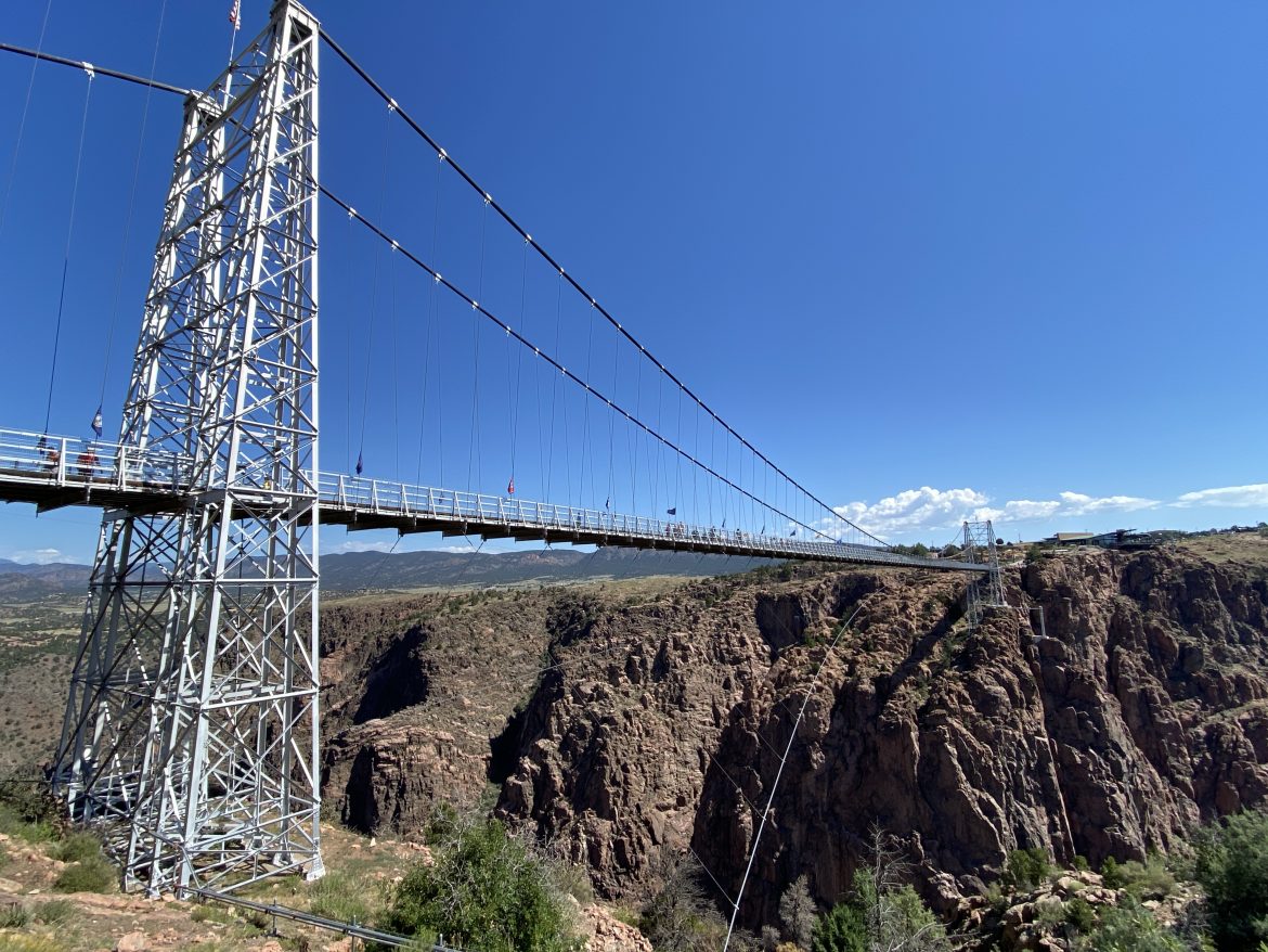 Am zweiten Tag in Cañon City wollten wir uns die Hängebrücke anschauen. Nathalie und ich waren hier schon früher und wussten in etwa, was uns erwartet. Als wir dort angekommen waren, wollte der Ranger tatsächlich 150.- USD für unsere kleine Reisegruppe. Ein Eintrittsgeld, bei dem wir zuerst kurz beraten mussten, ob es uns das überhaupt Wert war. Wir wollten ja bloss die Brücke sehen. Und ganz ehrlich, in der Schweiz gibt es auch tolle Hängebrücken. Kostenlos. Nun gut, wir bezahlten. Nach dem passieren des Kassenhäuschens sahen wir dann auch, weshalb der Eintritt so hoch war. Um die Brücke herum war ein Arsenal an weiteren Gebäuden gebaut worden. Das Gelände war nun ein Vergnügungspark. Wie schnell sich so etwas doch verändern kann! Bei unserem letzten Besuch vor etwa 12 Jahren, fuhren noch Autos über die Brücke und jetzt hatte es hier ein Kino, Seilrutschen, Gondelbahnen, Spielplätze (Mit Bierstand gleich daneben für die armen Papi’s 😊), Verpflegungsbuden und so weiter. Wir testeten das Angebot. Es war schon toll, aber halt etwas ganz anderes als früher. Im Kino erfuhren wir dann auch, warum sich der Park so stark verändert hatte. Im Jahr 2013 gab es einen Waldbrand, bei dem hier fast alles abgebrannt war. Sogar ein Teil der Brücke war in Mitleidenschaft gezogen worden. So musste sehr vieles neu gebaut werden. Ein guter Moment, um das Konzept zu verändern.